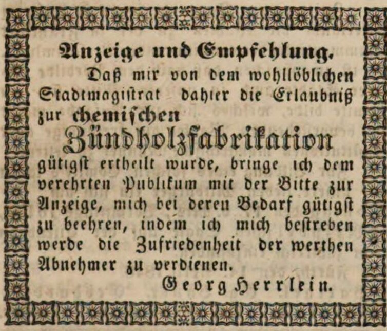 | Beschreibung | Zündholzfabrik des Georg Herrlein, April 1848 | ||