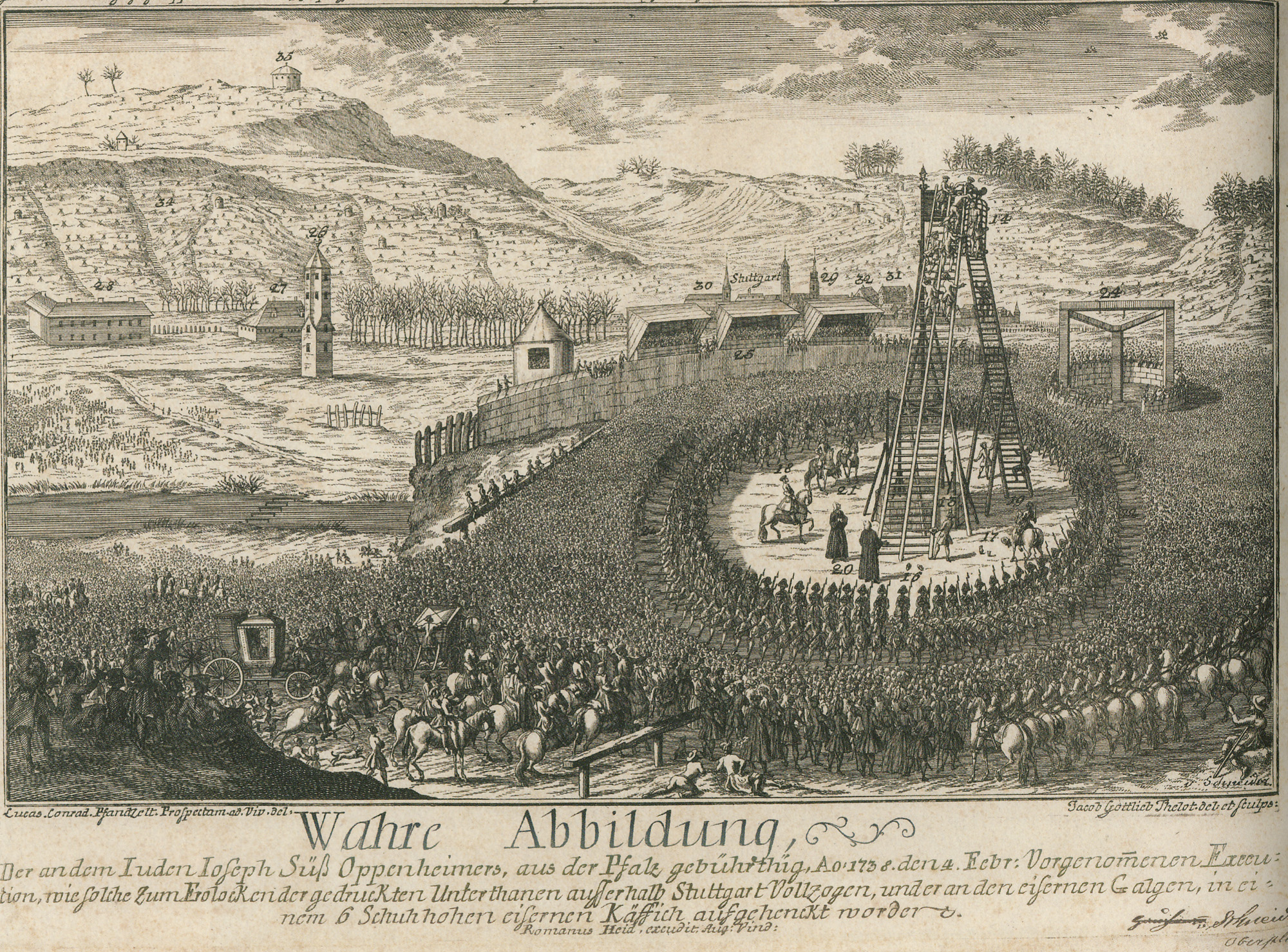 "Wahre Abbildung der an dem Iuden Ioseph Süß Oppenheimers, aus der Pfalz gebürthig, anno 1738, den 4. Februar, vorgenommenen Execution, wie solche zum Frolocken der gedruckten Unterthanen ausserhalb Stuttgart vollzogen, und er an den eisernen Galgen, in einem 6 Schuh hohen eisernen Käffich aufgehenckt worden."