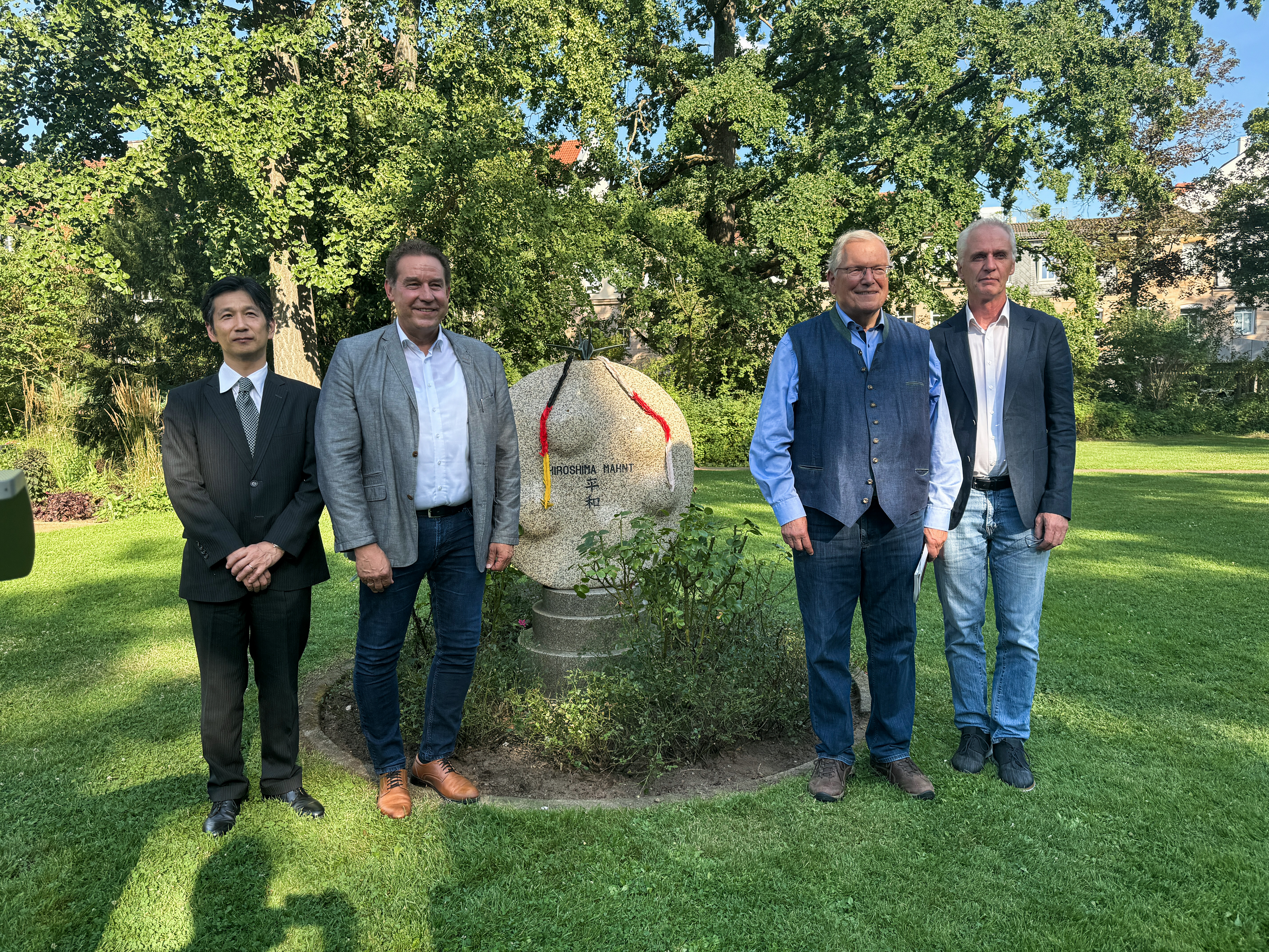 | Beschreibung | Japanischer Generalkonsul Kenichi Bessho mit Bürgermeister Markus Braun, BUND-Vorsitzender Hubert Weiger und Dekan Jörg Siechelstiel am Hiroshima-Gedenktag, Aug. 2024 | ||
