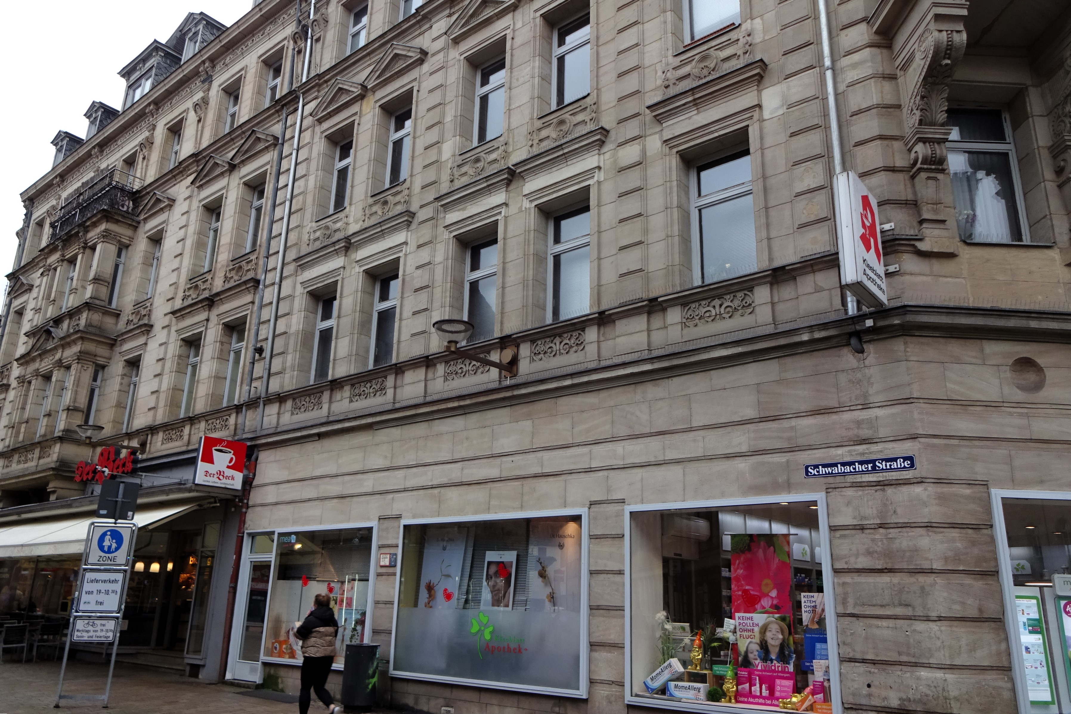 BeschreibungGebäude Hirschenstraße 1/3 mit Kleeblatt-Apotheke, März 2025