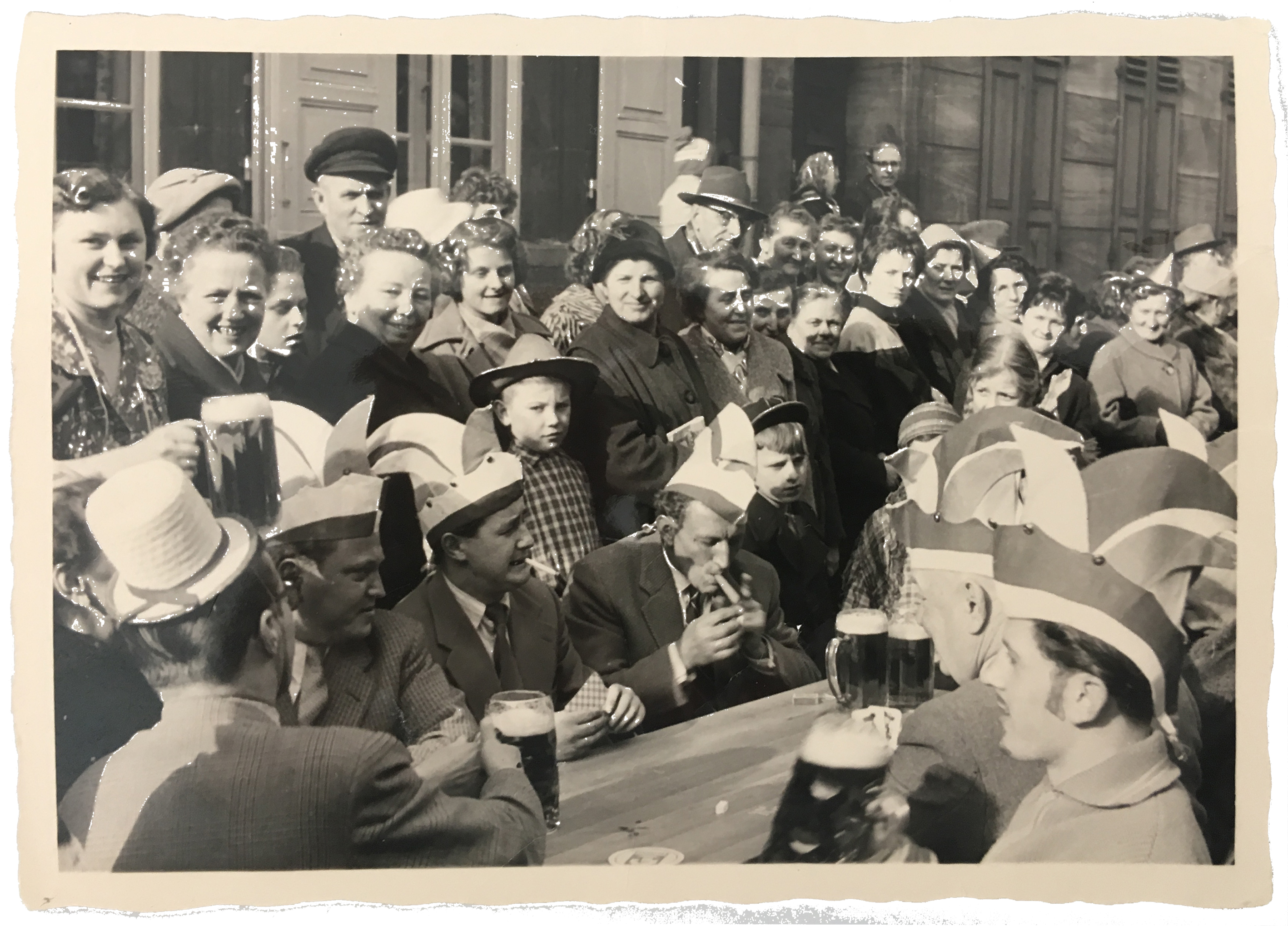| Beschreibung | Elferrat am Faschingsdienstag, Sitzende auf einem Parkplatz in der Hirschenstraße, 1955 | ||