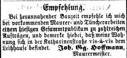 | Beschreibung | Maurermeister Johann Georg Hoffmann in der Katharinenstraße, Februar 1868 | ||