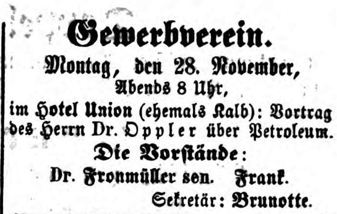| Beschreibung | Zeitungsanzeige Hotel Union, vormals Hotel Kalb, November 1864 | ||