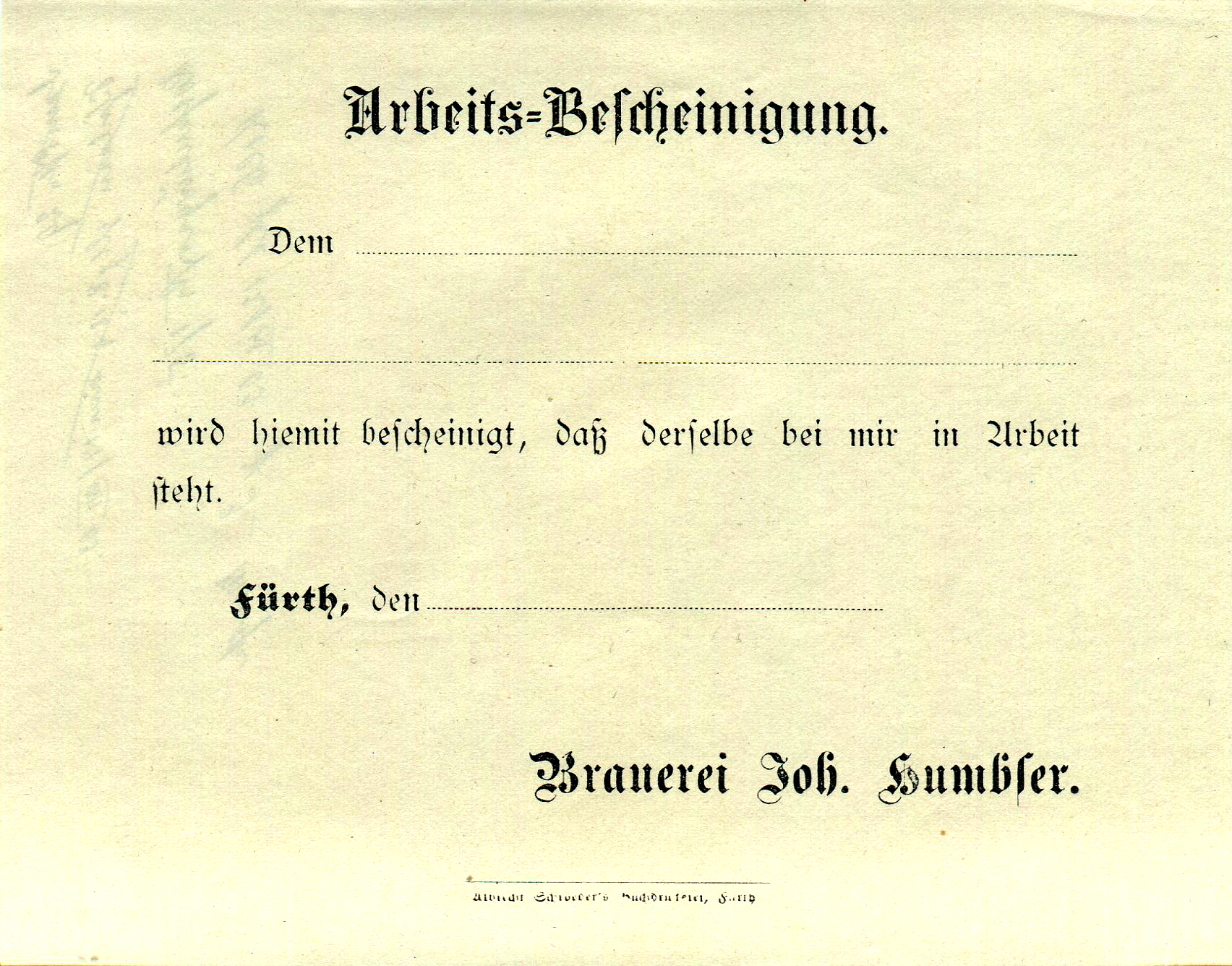 | Beschreibung | Arbeitsbescheinigung der Brauerei Humbser | ||