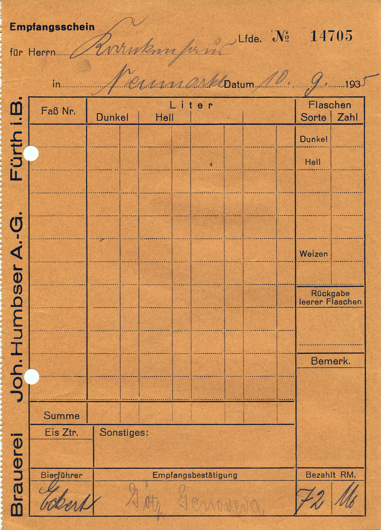 | Beschreibung | Empfangsschein der Brauerei Humbser, 1935 | ||