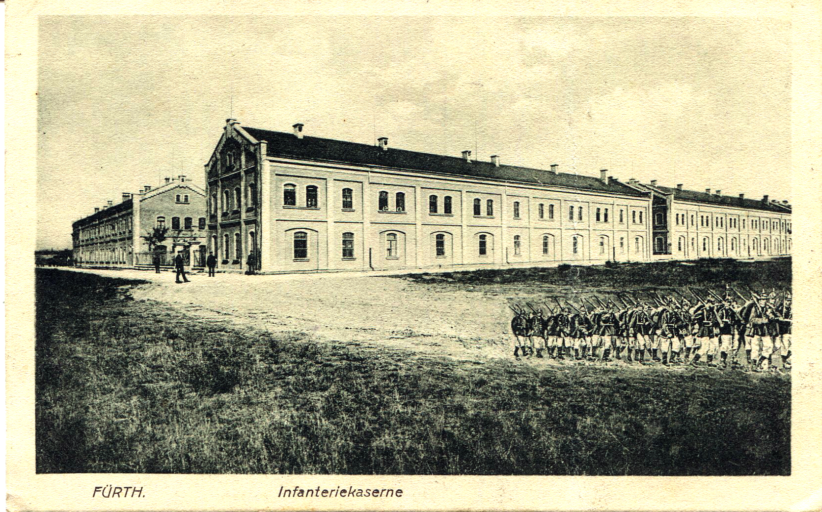 | Beschreibung | Die Infanteriekaserne in der Südstadt mit nachträglich retuschierten Soldaten, gel. 1915 | ||