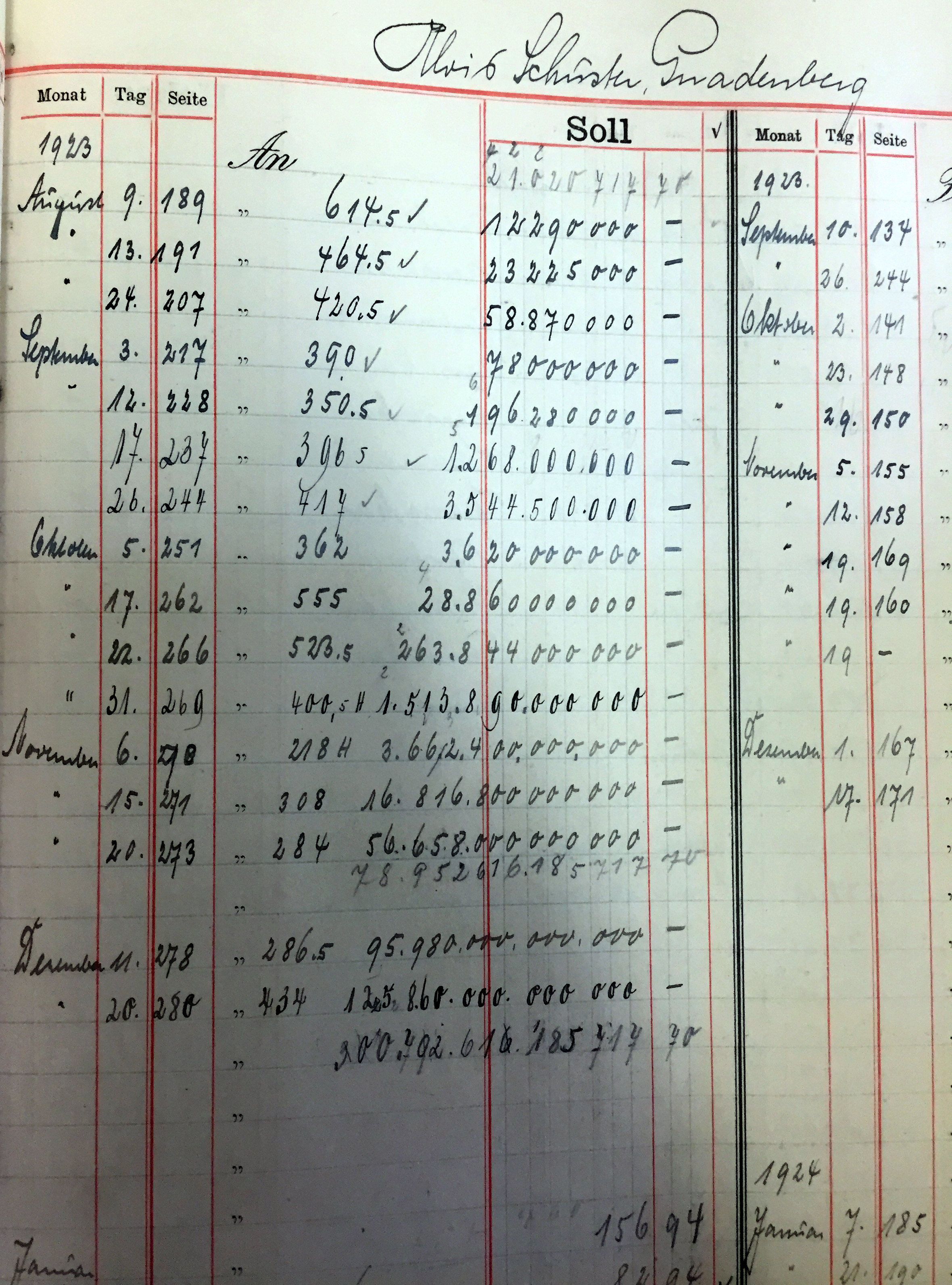 | Beschreibung | Ausschnitt: Bilanzbuch der Brauerei Humbser aus dem Jahr 1923 - Monat für Monat steigen die Zahlenkolonnen, bedingt durch die Inflation | ||