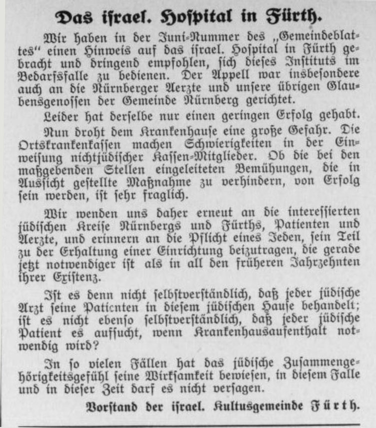 | Dateiinfo (Bild-Unterschrift und Info-Box, automatisch erstellt) | Solidaritätsaufruf der Kultusgemeinde für das israel. Hospital; 1- September 1933 Urheber: Nürnberg-Fürther Israelitisches Gemeindeblatt<br>Erstellungsdatum: 1. September 1933<br>Lizenz: cc-by-sa-3.0 | ||