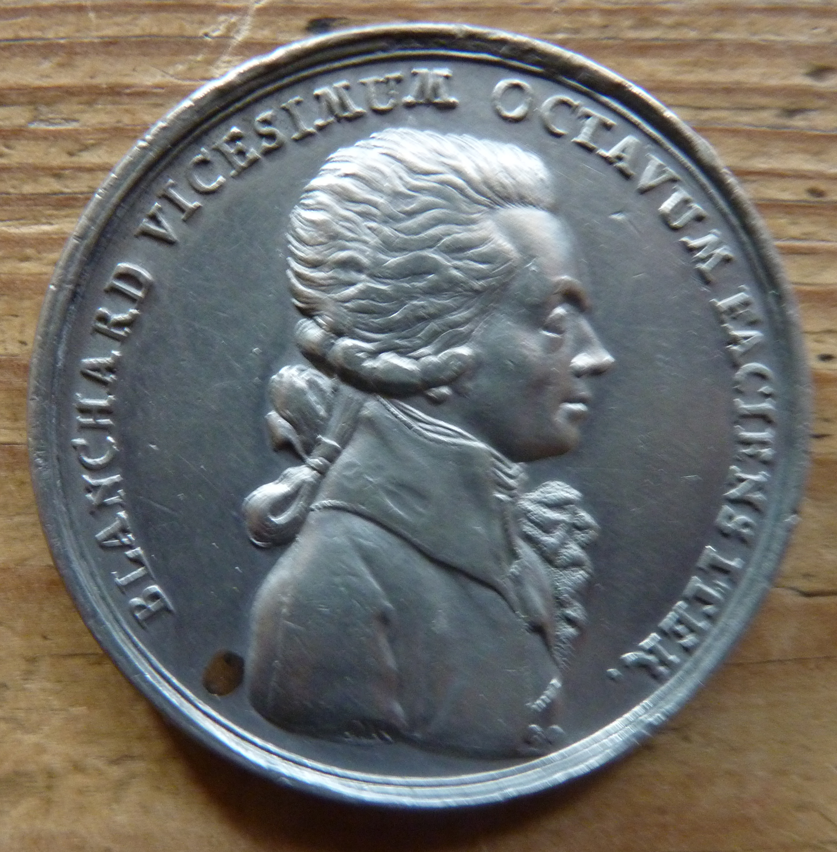 | Beschreibung | Zinnmedaille von J. C. Reich zur Ballonfahrt von Jean Pierre Blanchard 1797 | ||