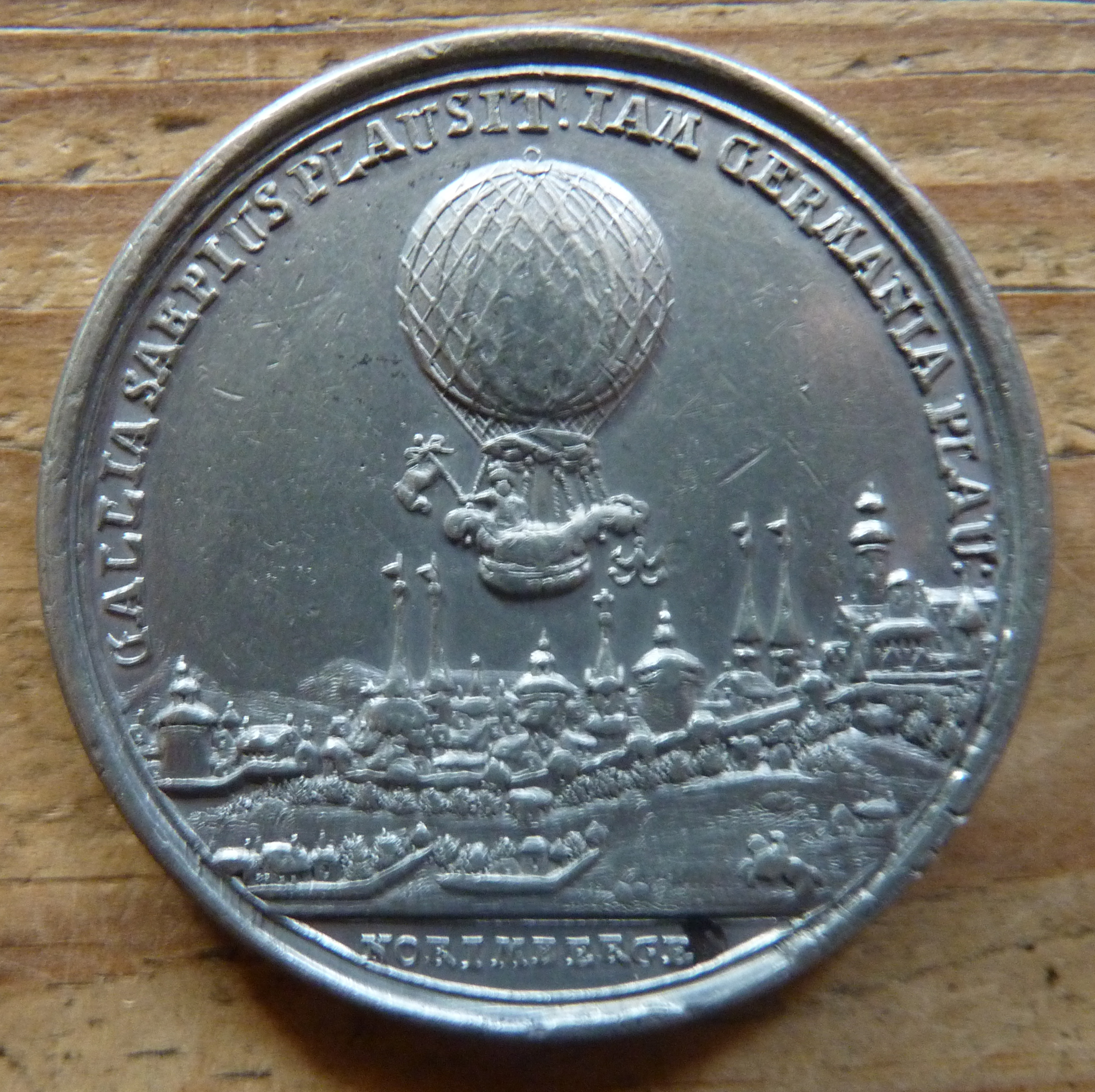 | Beschreibung | Zinnmedaille von J. C. Reich zur Ballonfahrt von Jean Pierre Blanchard 1797 | ||