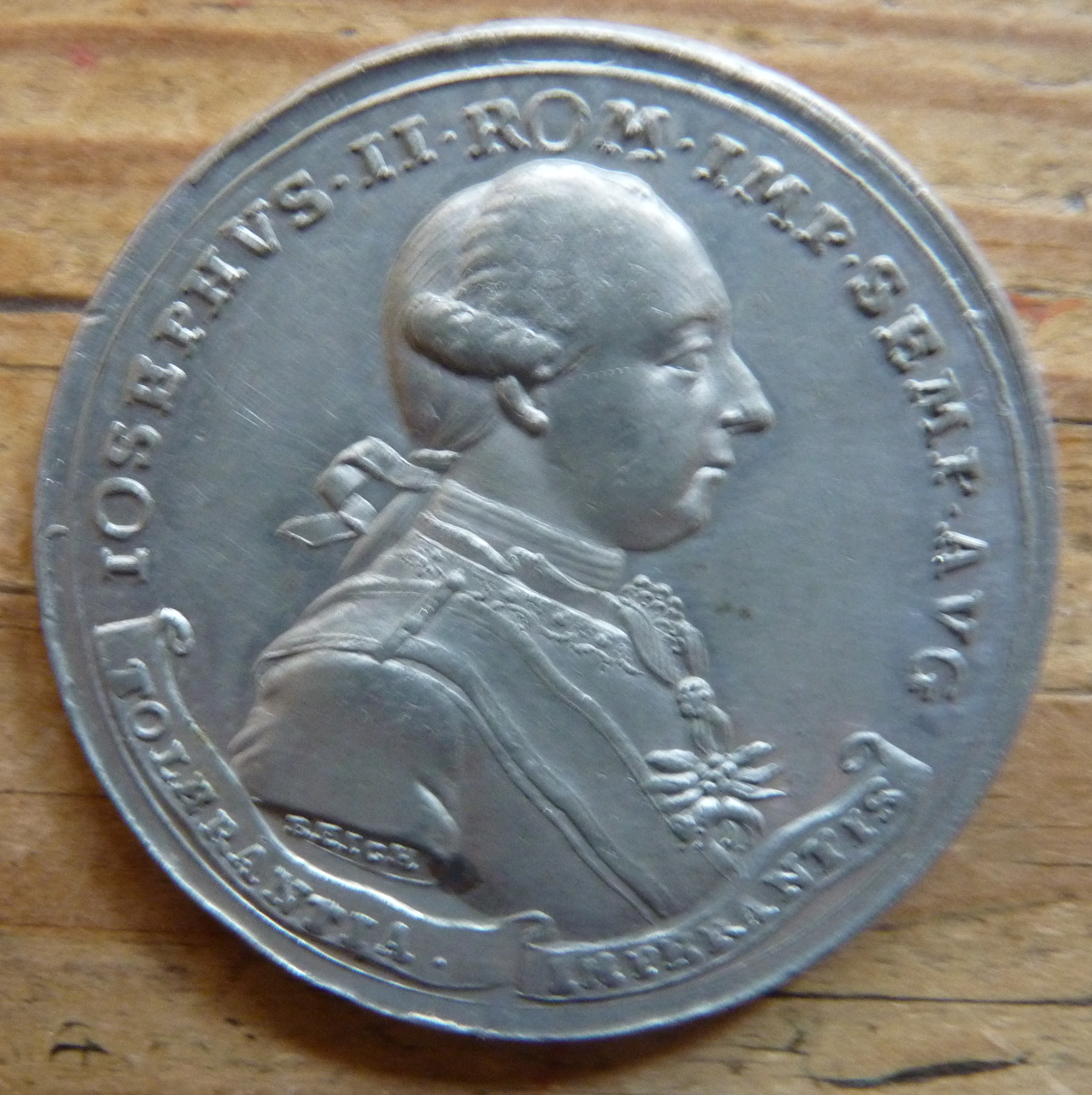 | Beschreibung | Zinnmedaille von J. C. Reich zum Toleranzpatent Kaiser Joseph II. Avers | ||