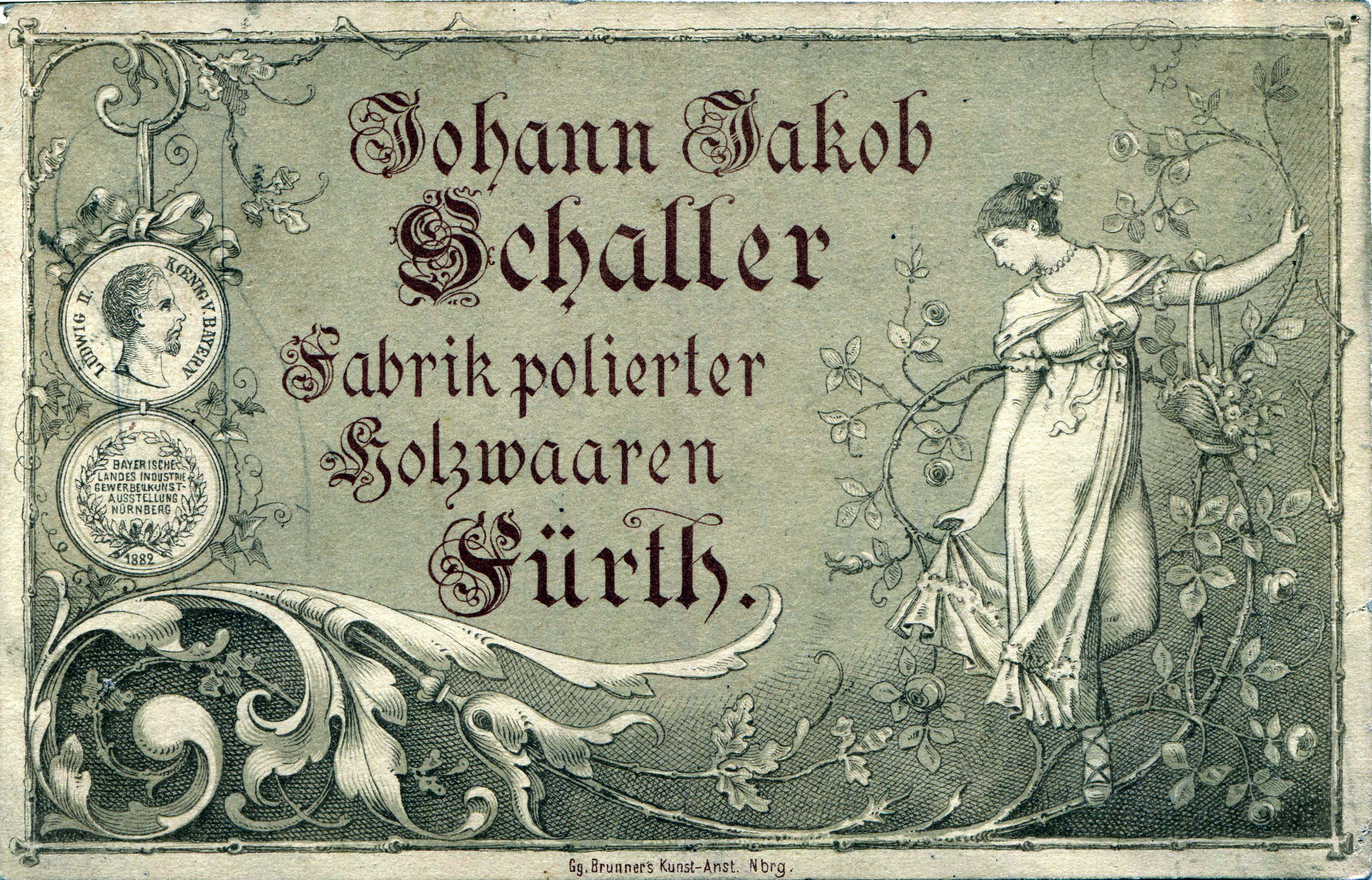 | Beschreibung | Werbekarte "Fabrik polierter Holzwaren von Johann Jakob Schaller", ca. 1900 | ||