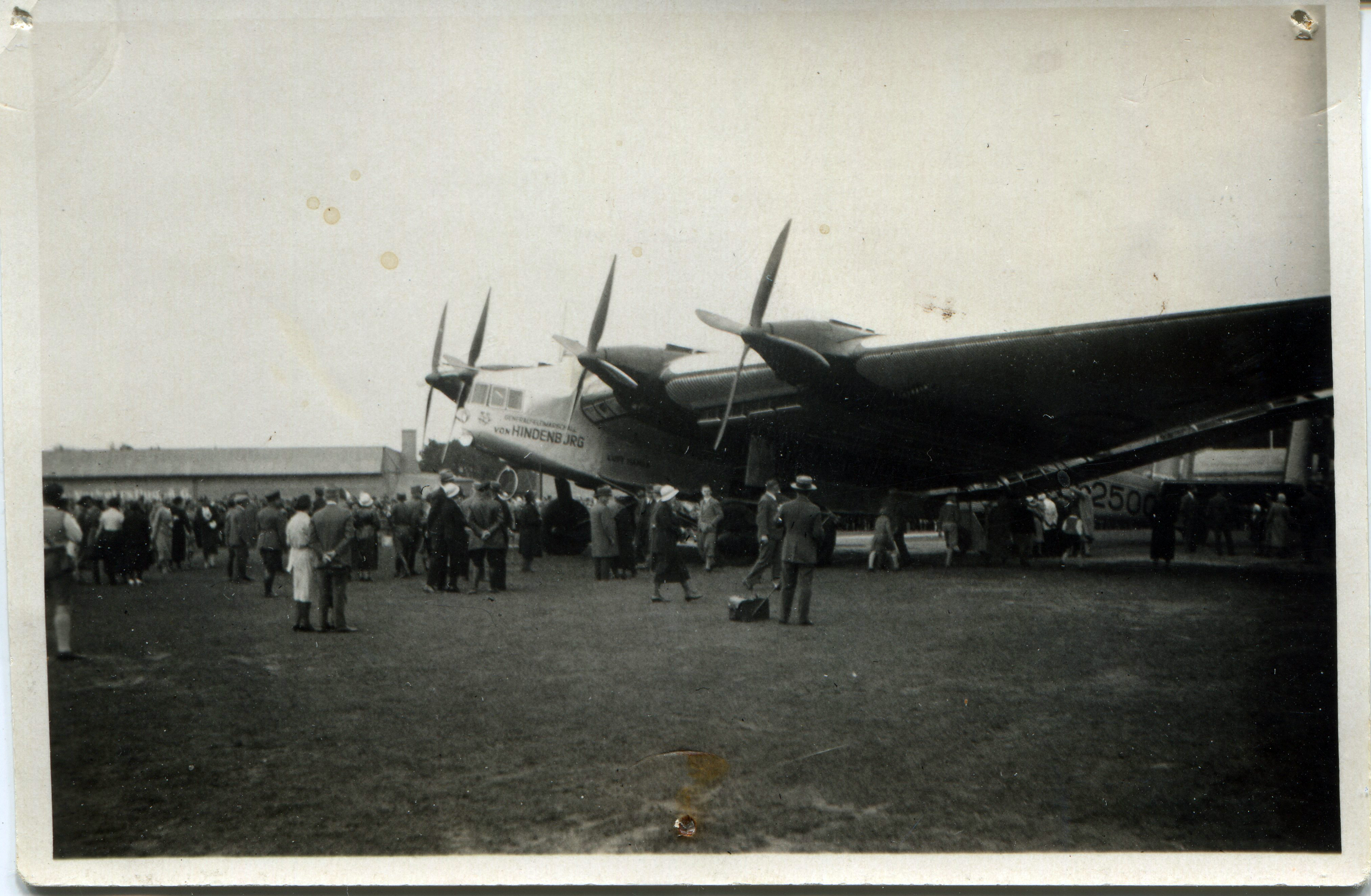 | Beschreibung | Die Junkers G38 Generalfeldmarschall von Hindenburg, vermutlich auf dem ehem. Flugplatz in Atzenhof, ca. 1935 | ||