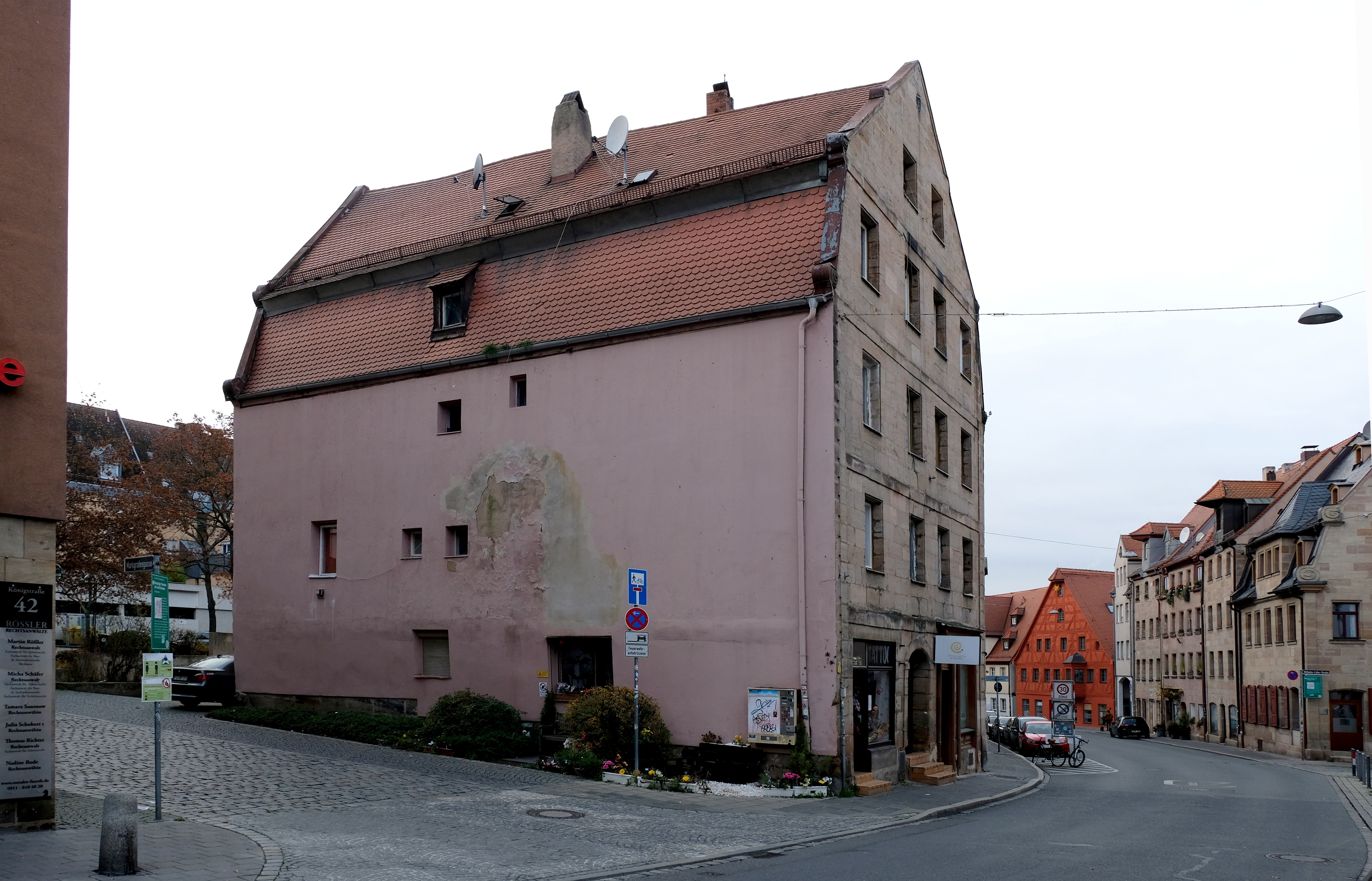 | Beschreibung | Eines der wenigen Häuser, welches die Sanierung des Gänsberg "überlebt" hat - Königstraße 40, hier mit Blick in die heutige Markgrafengasse. Nov. 2020 | ||