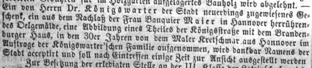 | Beschreibung | Ankündigung, dass ein von Wilhelm Königswarter der Stadt Fürth geschenktes Ölgemälde ausgestellt werden soll, Juni 1872 | ||