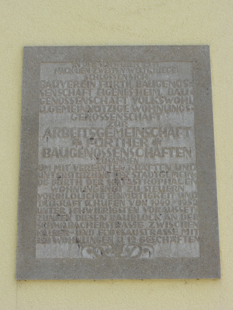 | Beschreibung | Gedenktafel "Arbeitsgemeinschaft Fürther Baugenossenschaften" in der Buschingstr. | ||