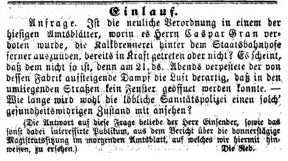 Redaktionsanfrage zum Verbot der Kalkbrennerei des Caspar Gran; Fürther Tagblatt, 24.07.1864