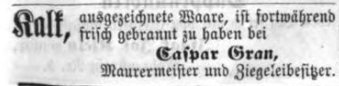 | Beschreibung | Zeitungsanzeige des Maurermeisters Caspar Gran zum Kalkverkauf, November 1865 | ||