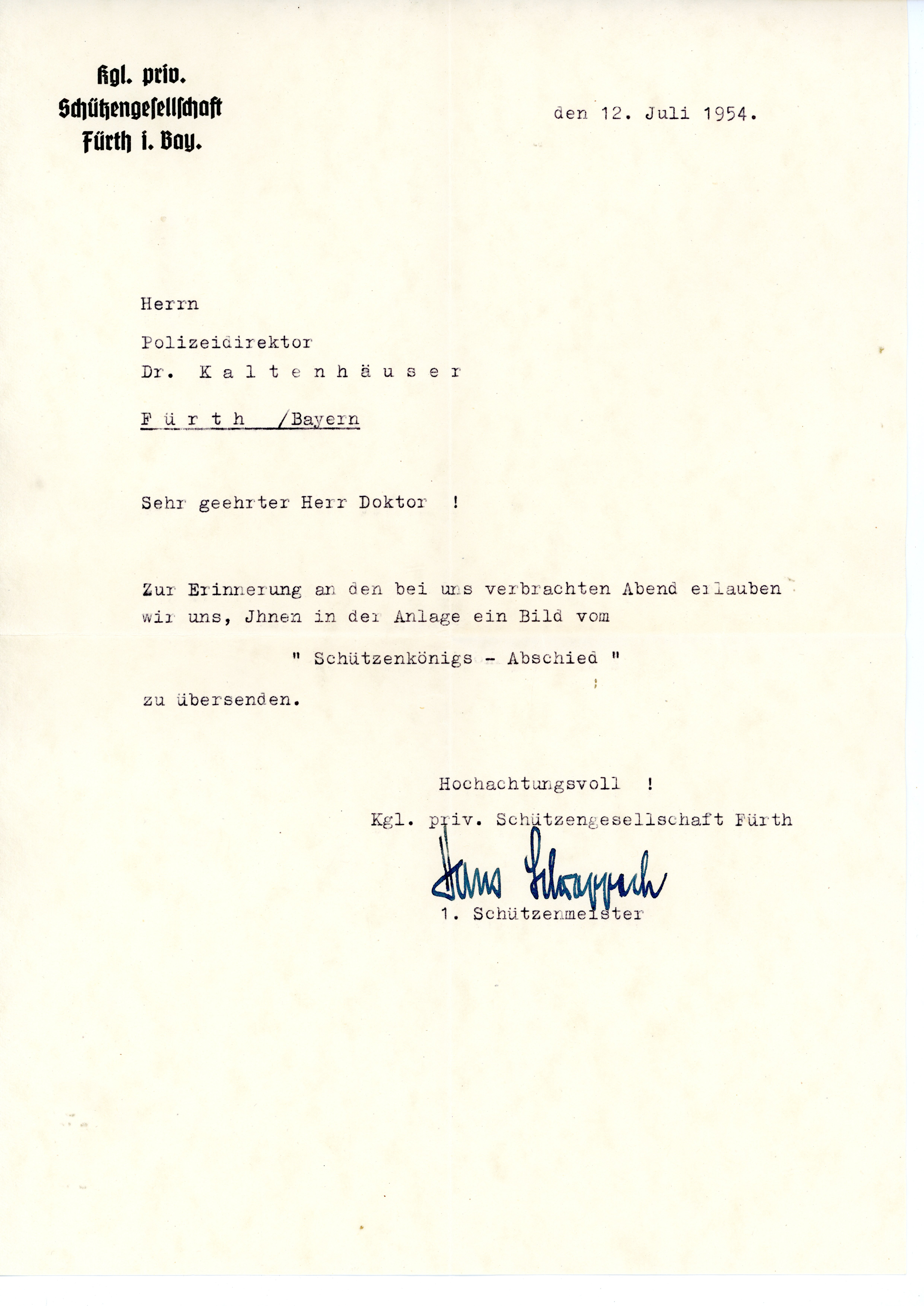 | Beschreibung | Schreiben an Dr. Kaltenhäuser von der Königlich privilegierte Schützengesellschaft Fürth, Juli 1954 | ||