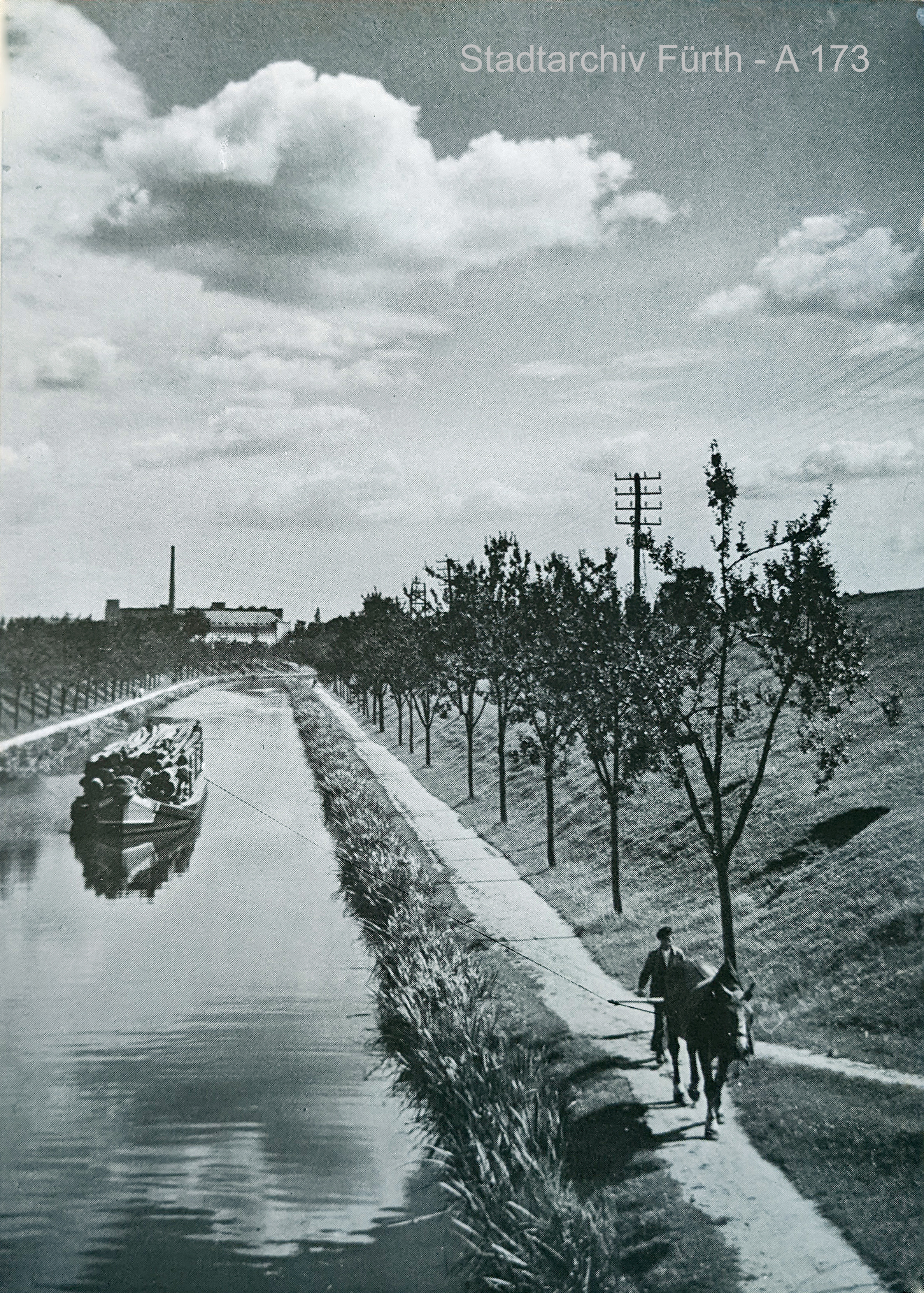 Das Schiff wird auf der Höhe der Kurgartenstraße Richtung Fürth getreidelt.