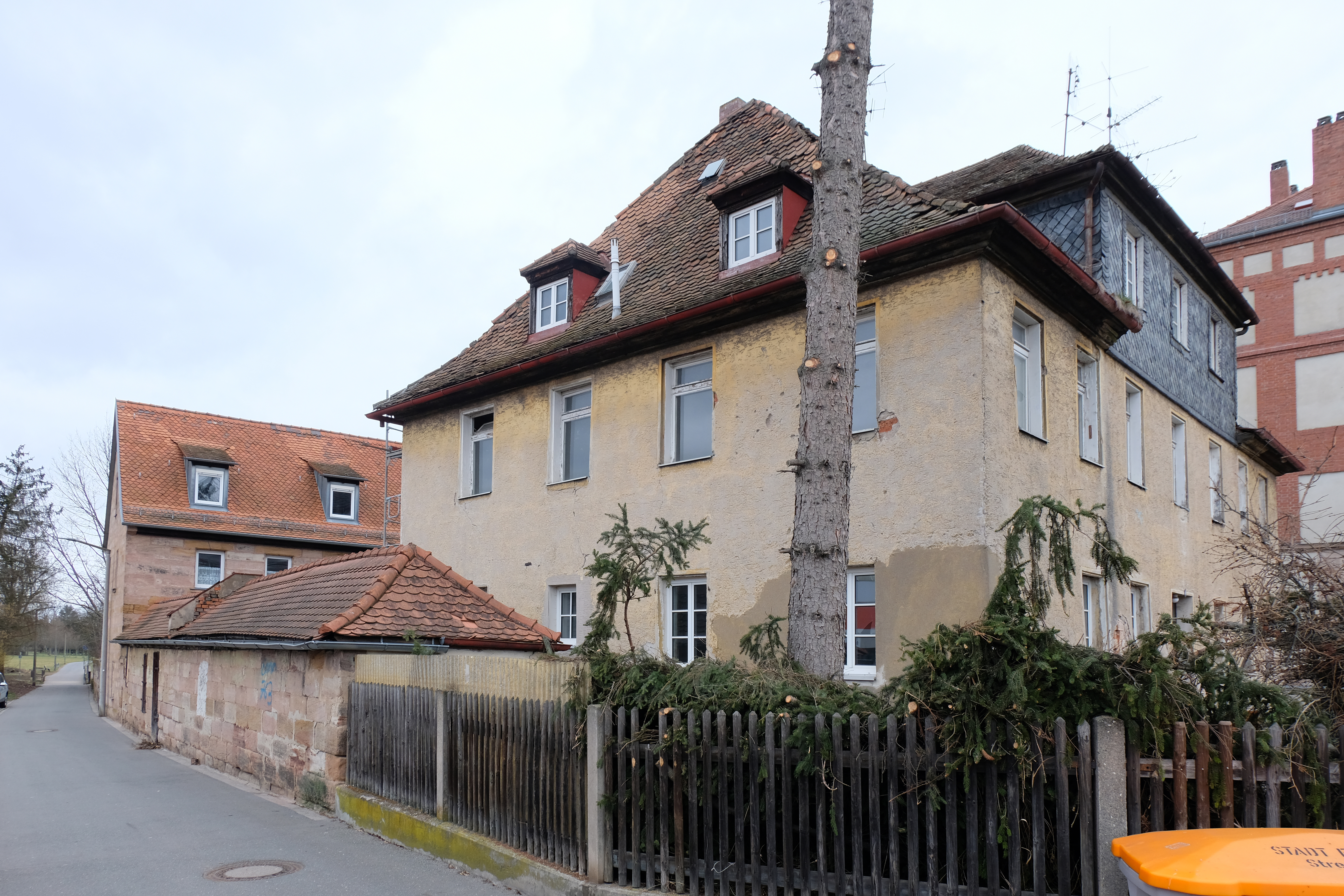 | Beschreibung | Seitliche Ansicht der Kapellenstraße 9 mit Seitentrakt am Heckenweg, vermutlich ehem. Tierställe, März 2023 | ||