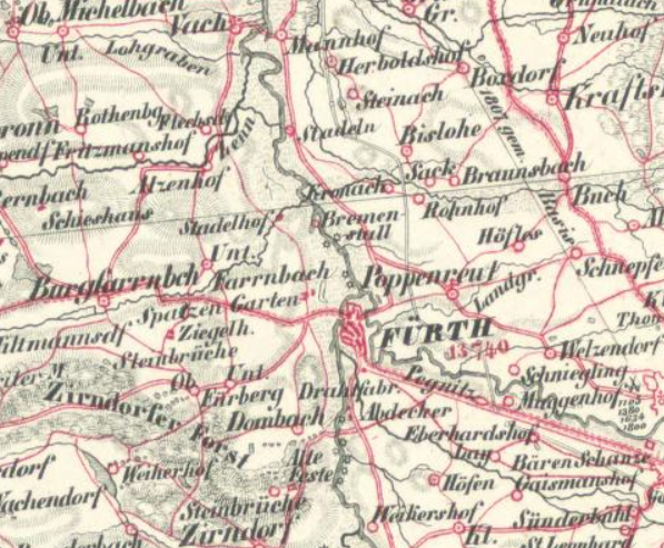 | Beschreibung | Ausschnitt aus der Landkarte "Nürnberg" von 1842 (Maßstab 1:200 000) | ||