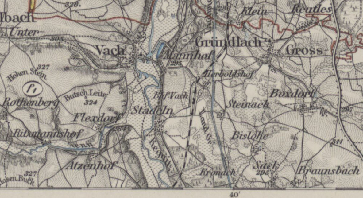 | Dateiinfo (Bild-Unterschrift und Info-Box, automatisch erstellt) | Ausschnitt aus der Karte des Deutschen Reiches 1:100 000, Blatt 549, "Erlangen", herg. 1888 Urheber: hrsg. vom topogr. Bureau des K. Bayer. General Stabes<br>Erstellungsdatum: 1888<br>Lizenz: cc-by-nc-sa-4.0 | ||