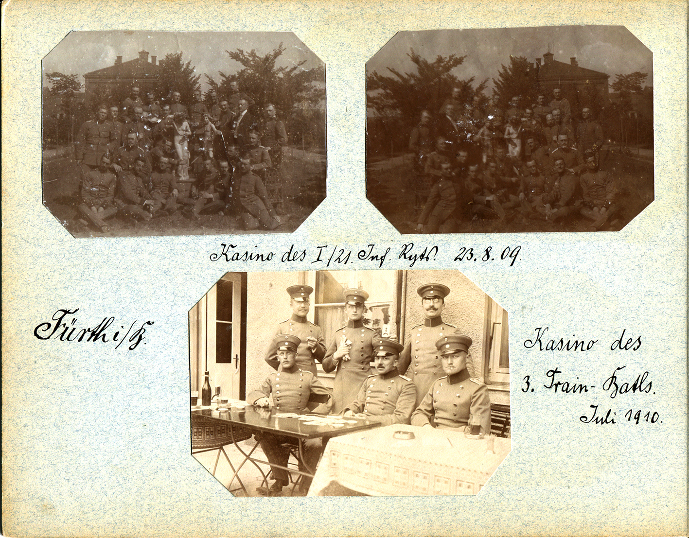 | Beschreibung | Fotogruppe aus einem ehem. Fotoalbum mit Bildern aus dem Kasino des 21. Inf. Regiments sowie der 3. Train-Abteilung | ||