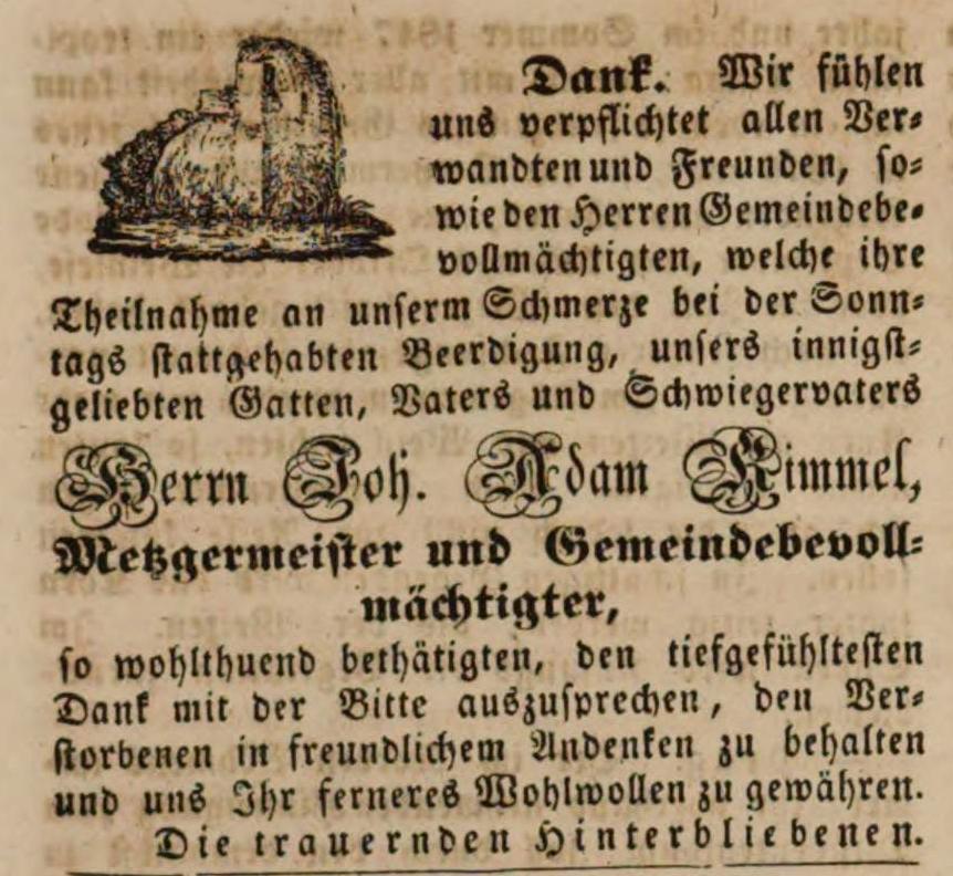 | Beschreibung | Traueranzeige für den Metzgermeister und Gemeindebevollmächtigten Johann Adam Kimmel, Januar 1847 | ||