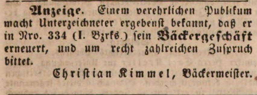 | Beschreibung | Zeitungsanzeige des Bäckers Christian Kimmel, Juni 1846 | ||