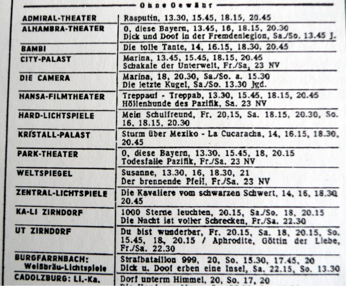 | Dateiinfo (Bild-Unterschrift und Info-Box, automatisch erstellt) | Kino Programm von Fürth mit Landkreis aus der FN vom 30.09.1960 Urheber: Fürther Nachrichten<br><br>Lizenz: cc-by-sa-3.0 | ||