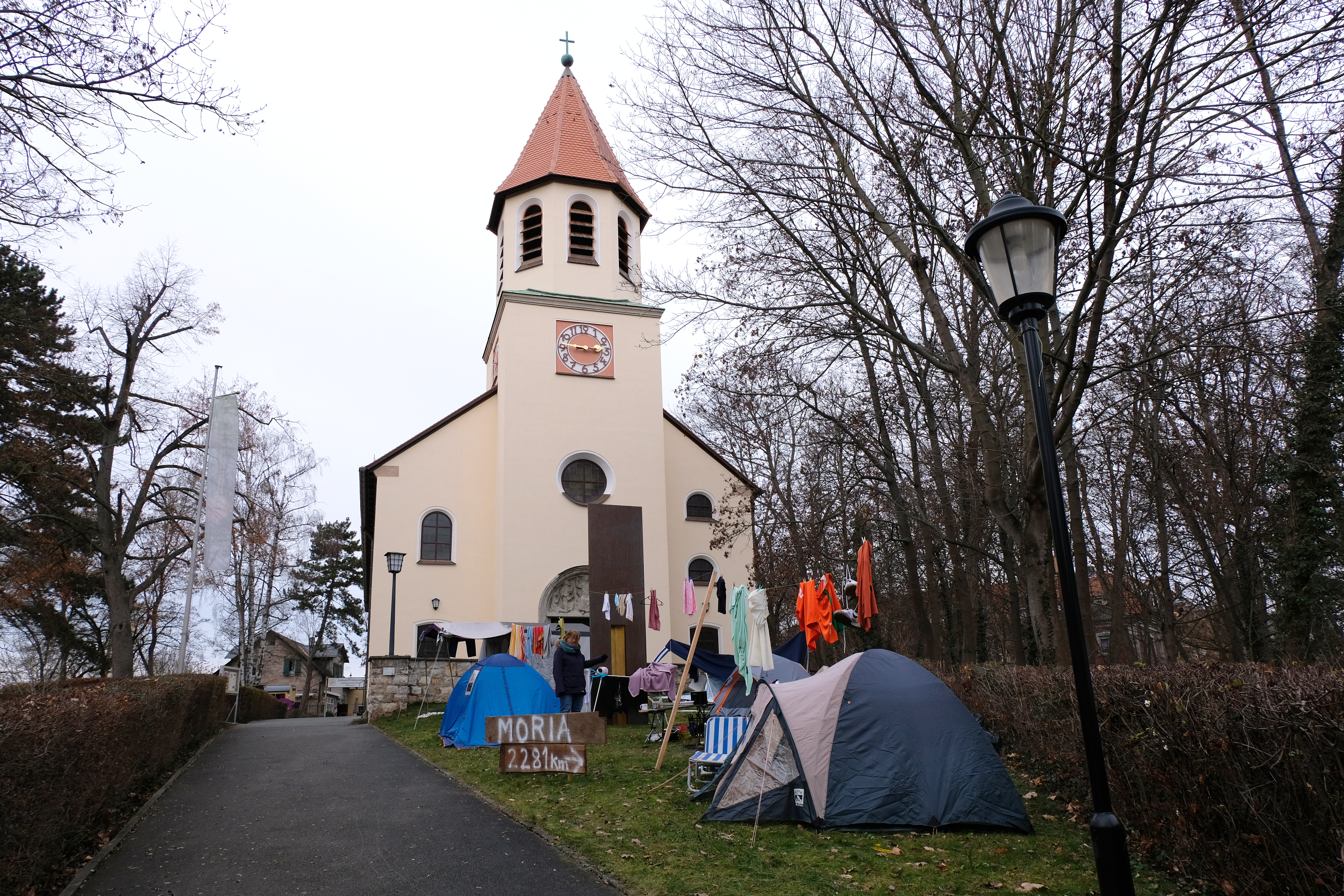 | Beschreibung | Die Kirche St. Martin auf der Wilhelmshöhe mit einer Aktion gegen das Flüchtlingscamp in Moria, Dez. 2020 | ||