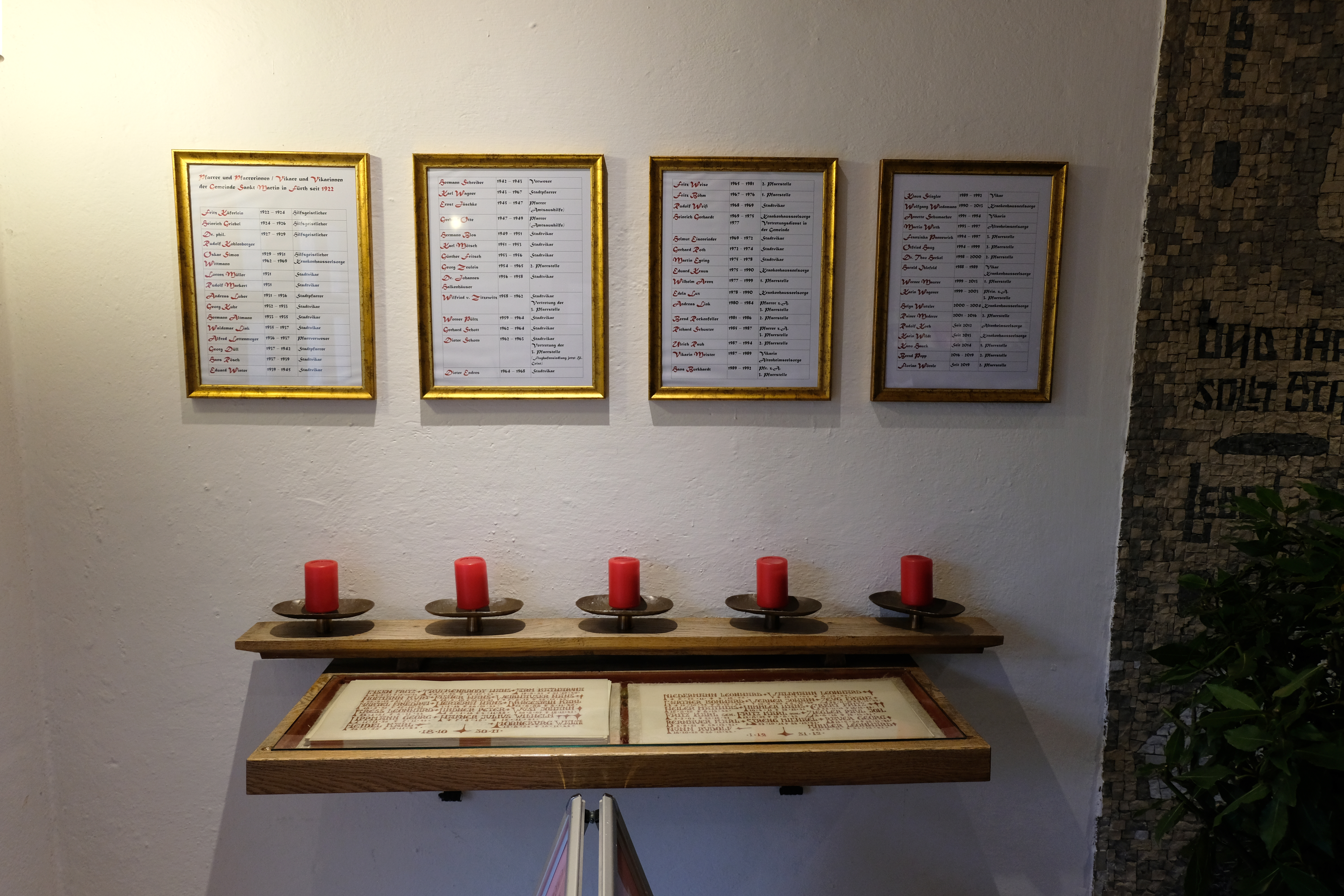 | Beschreibung | Totenbuch und Liste aller Pfarrer seit 1922 der Kirche St. Martin auf der Wilhelmshöhe im Eingangsbereich, Dez. 2020 | ||