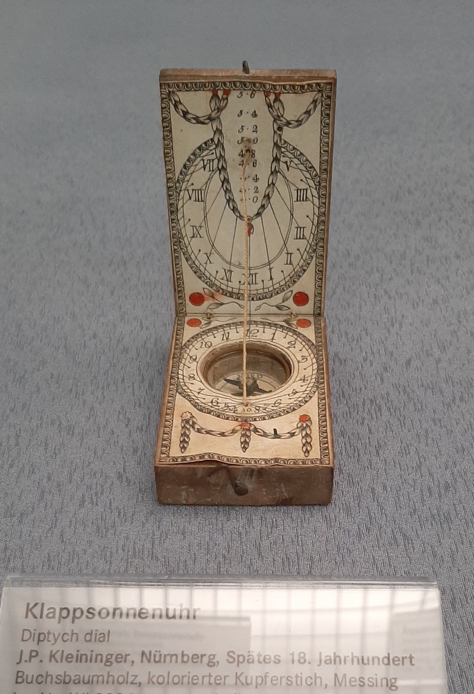 BeschreibungKlappsonnenuhr von J. P. Kleininger im GMN (dort vermutlich falsch mit "Nürnberg" beschriftet), 2026