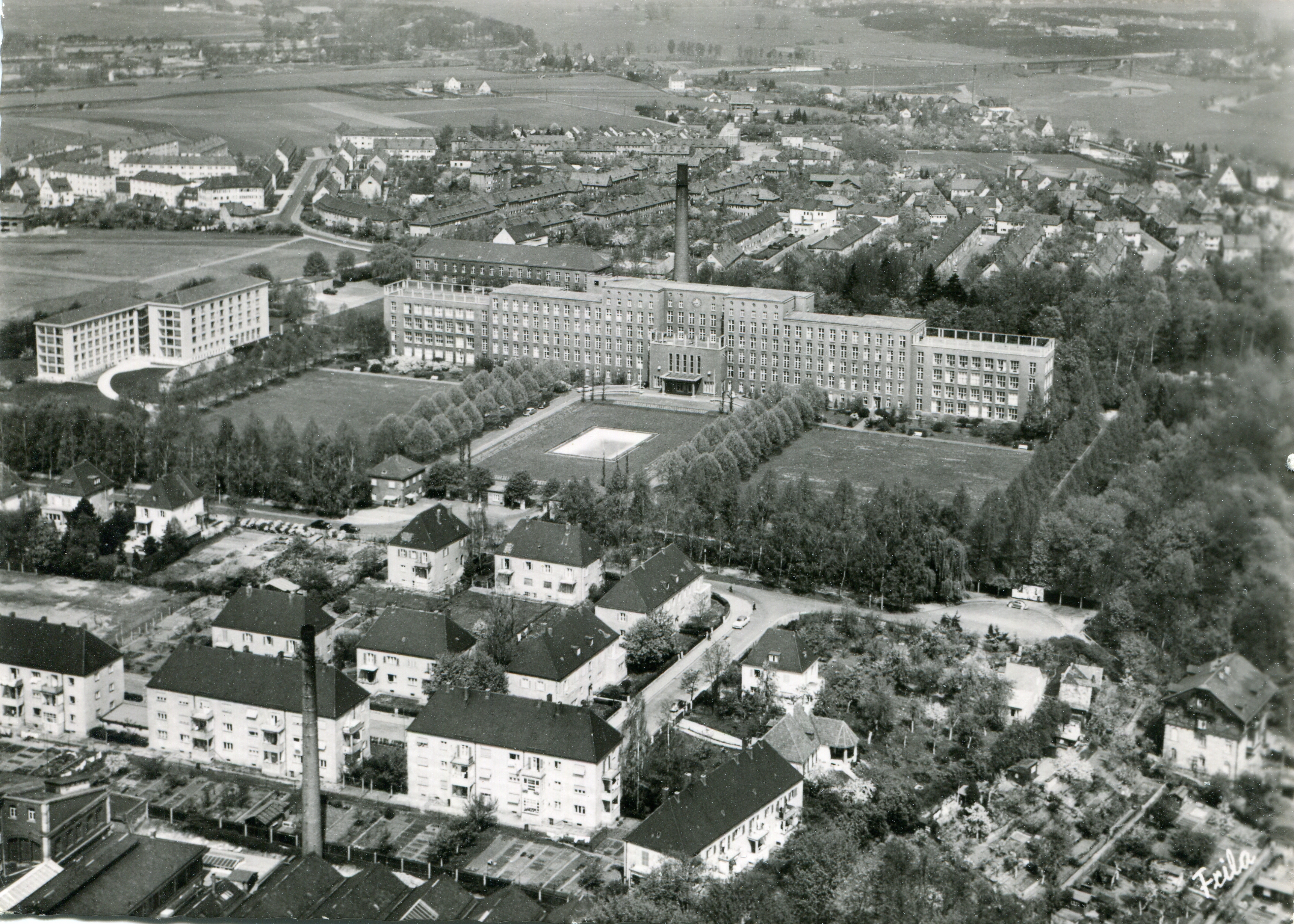| Beschreibung | Luftaufnahme Klinikum, im Vordergrund Häuser an der Nottelbergstraße und die Gebäude der Bergbräu-Brauerei, rechts oben die Regnitztalbrücke, r. unten Kleingartenkolonie Schlössla, Historische Postkarte, um 1960 | ||