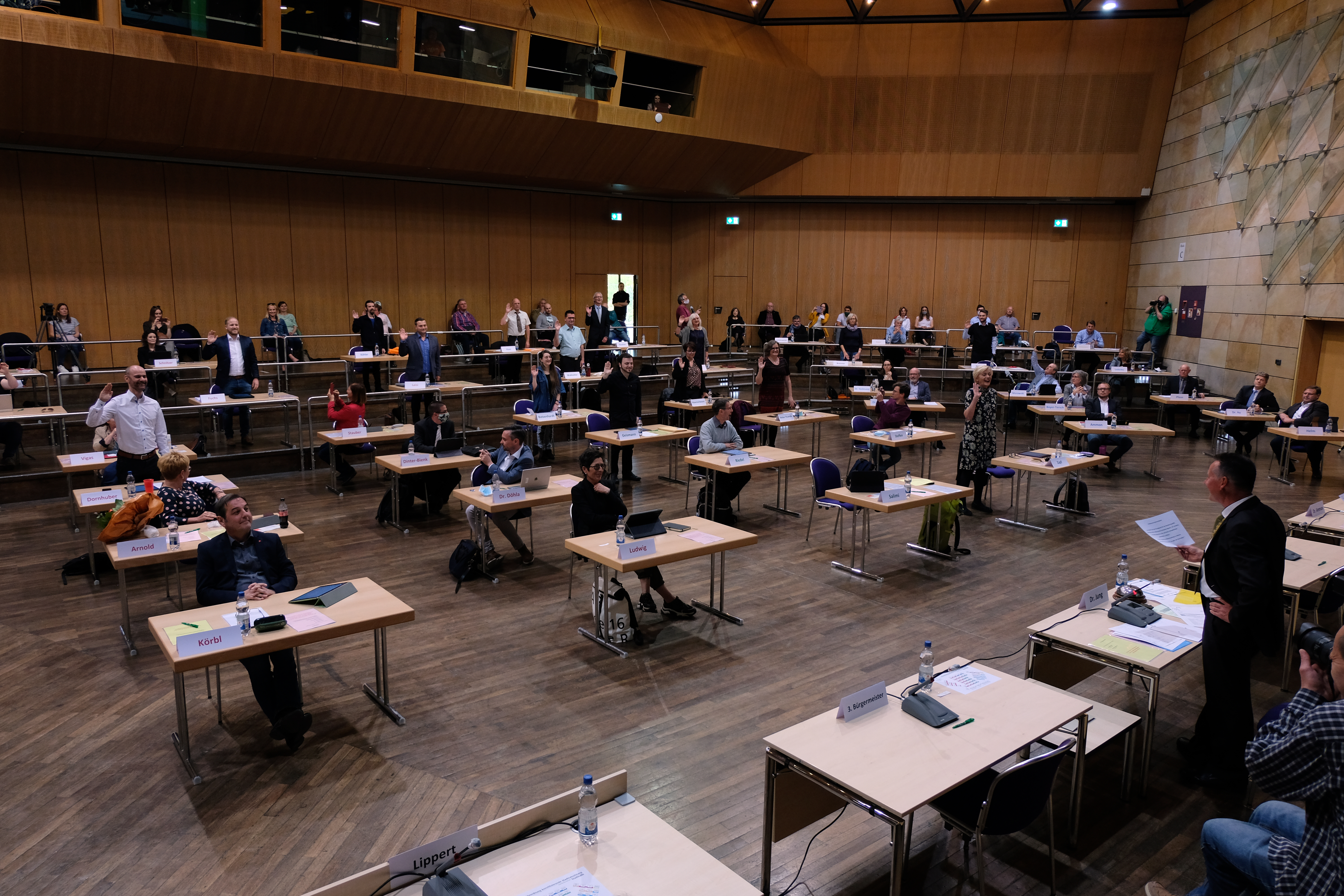 | Beschreibung | Vereidigung der neu gewählten Stadträte während der konstituierende Stadtratssitzung in der Stadthalle als Ausweichort für den Ratshaussaal aufgrund der COVID-19-Pandemie, Mai 2020 | ||