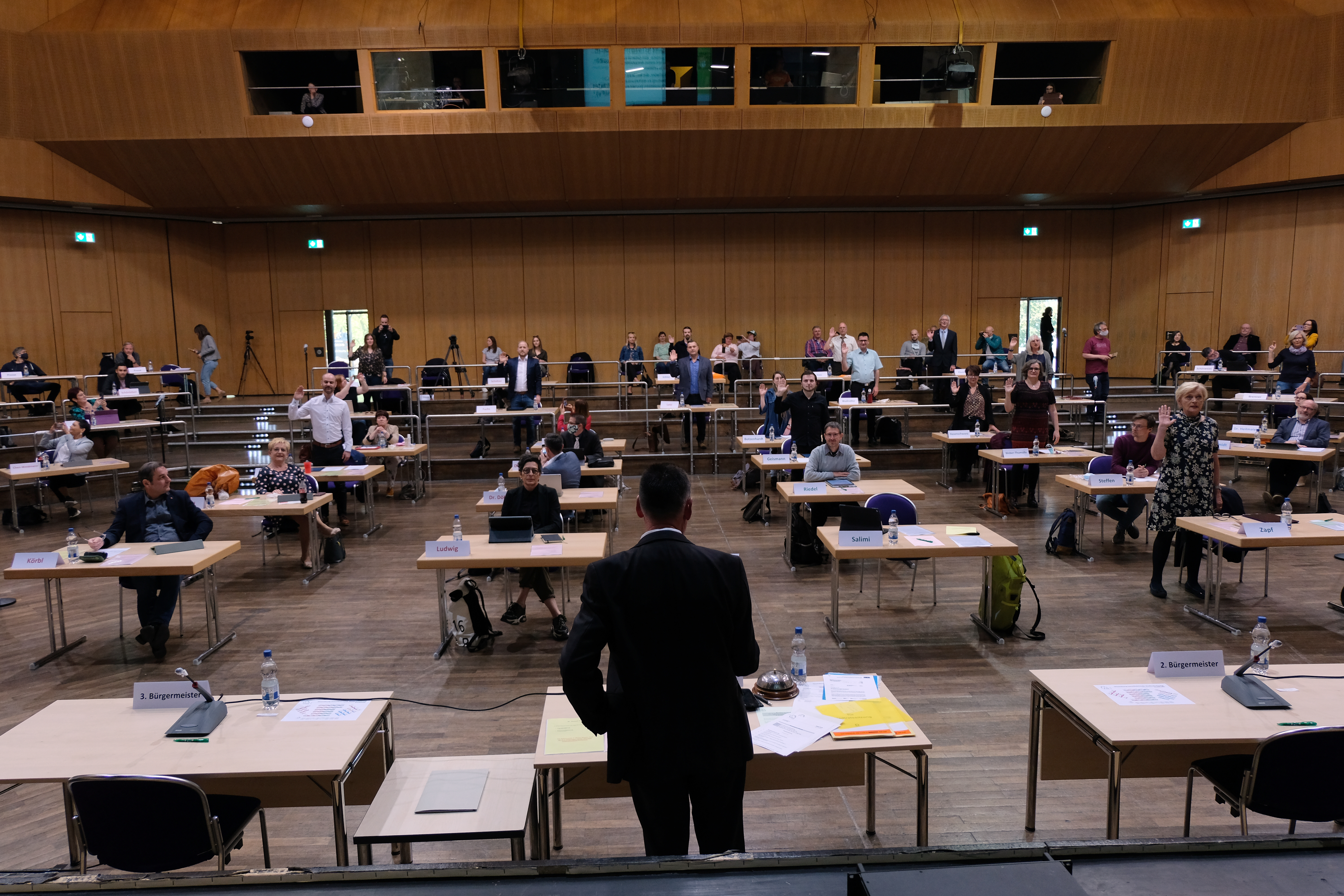 BeschreibungVereidigung der neu gewählten Stadträte während der konstituierende Stadtratssitzung in der Stadthalle als Ausweichort für den Ratshaussaal aufgrund der COVID-19-Pandemie, Mai 2020
