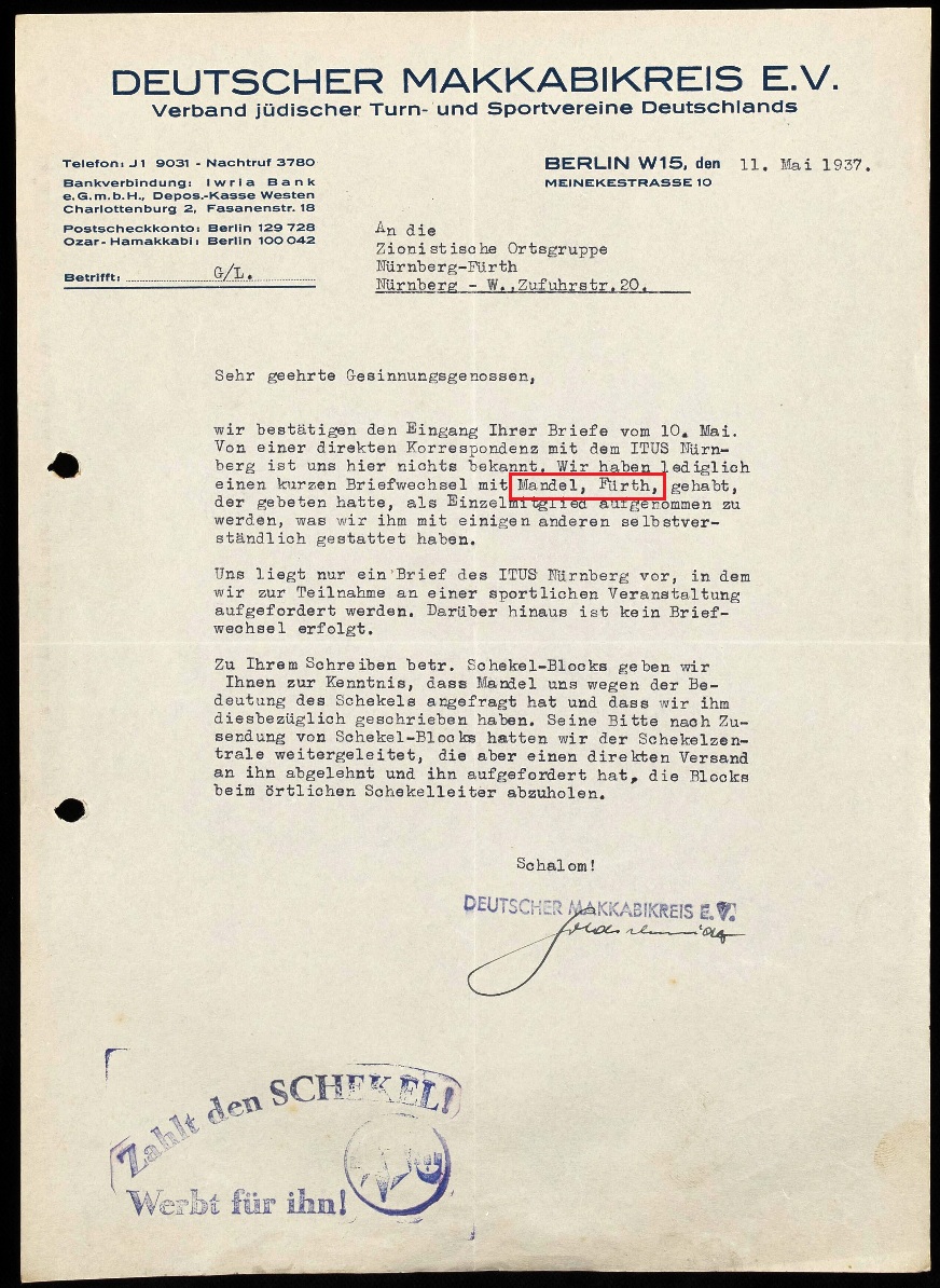 | Dateiinfo (Bild-Unterschrift und Info-Box, automatisch erstellt) | Bestätigung Briefverkehr über Einzelaufnahme Mandel, Fürth Urheber: Deutscher Makkabikreis<br>Erstellungsdatum: 11. Mai 1937<br>Lizenz: cc-by-nc-sa-3.0 | ||