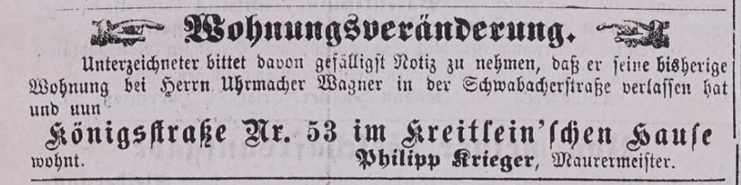 | Beschreibung | Wohnungsveränderung des Maurermeisters Krieger, Mai 1876 | ||
