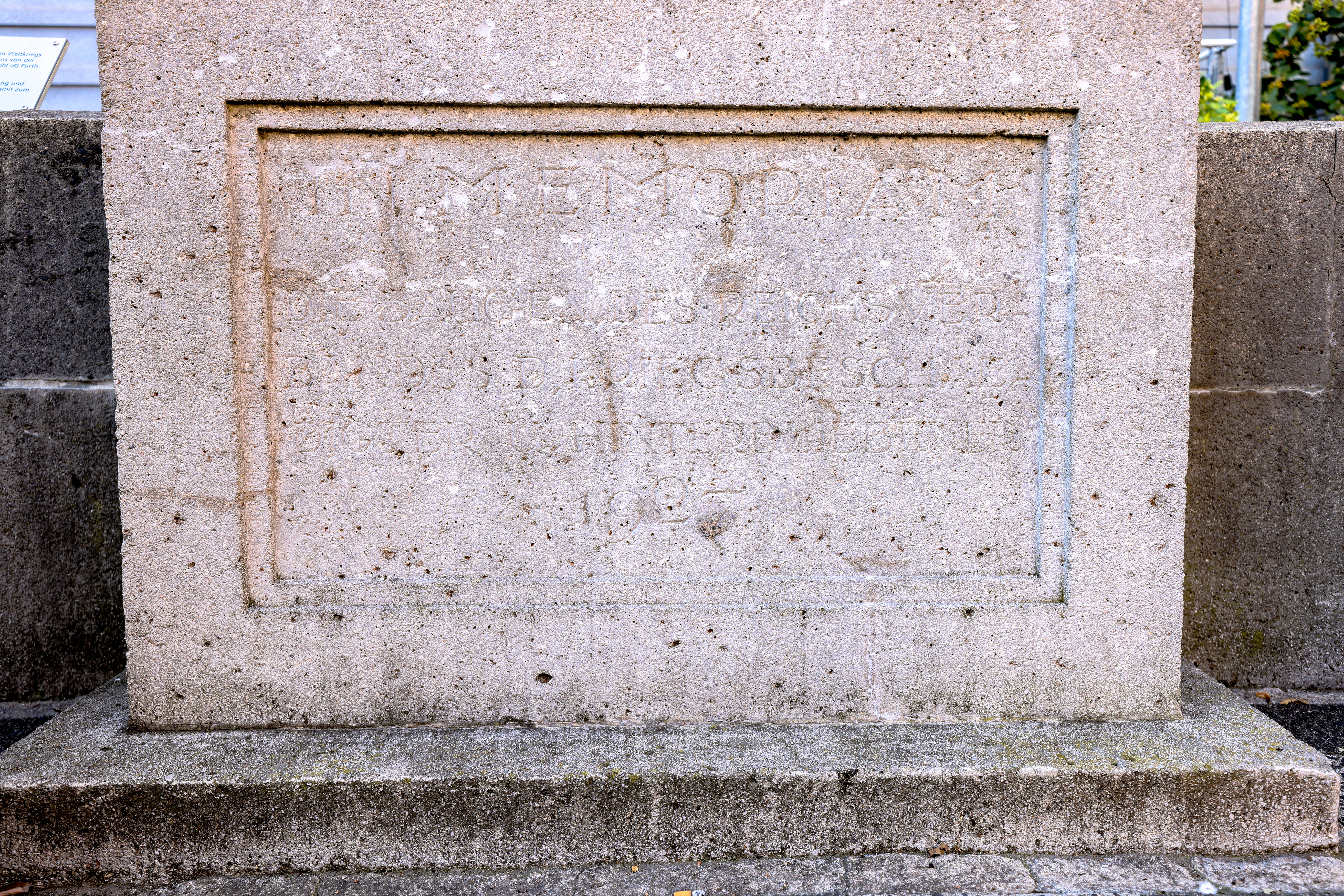 BeschreibungDer Sockel des Kriegerdenkmals in der Kaiserstraße mit der Inschrift: IN MEMORIAM Die Bangen des Reichsverbandes d. Kriegsbeschädigter und Hinterbliebener - 1927