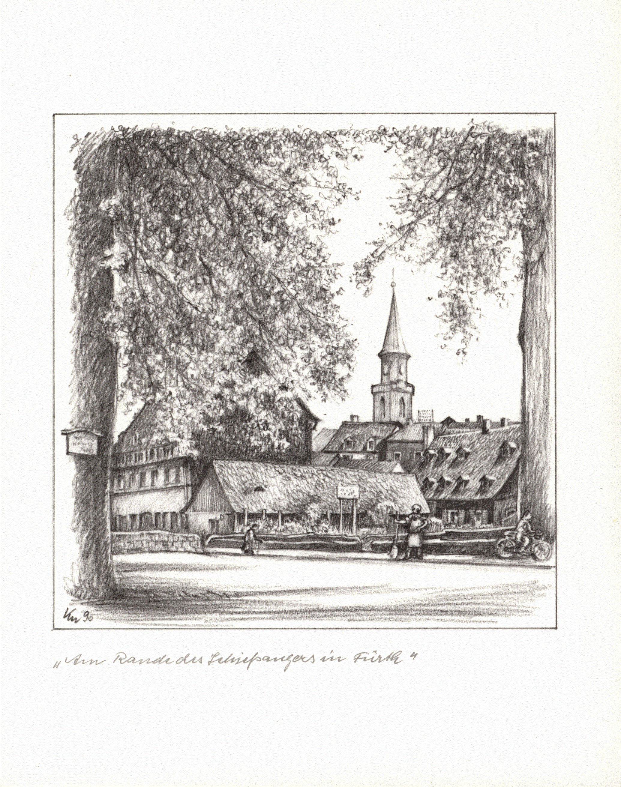 | Beschreibung | Blick vom Schießanger auf die Altstadt mit St. Michael, gezeichnet von Heinrich Kuchenreuther, erstellt um 1990 | ||