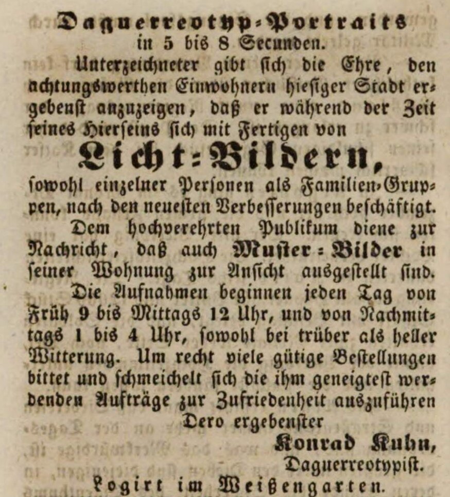 | Dateiinfo (Bild-Unterschrift und Info-Box, automatisch erstellt) | Zeitungsannonce des Fotografen Konrad Kuhn, Januar 1846 Erstellungsdatum: 1846<br>Lizenz: Out of copyright - non commercial re-use | ||