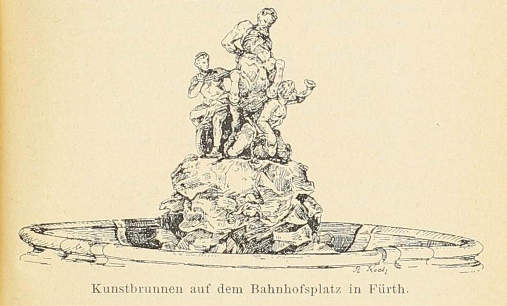 | Beschreibung | Zeichnung des "Kunstbrunnen auf dem Bahnhofsplatz in Fürth" in einem Reiseführer von 1899 | ||