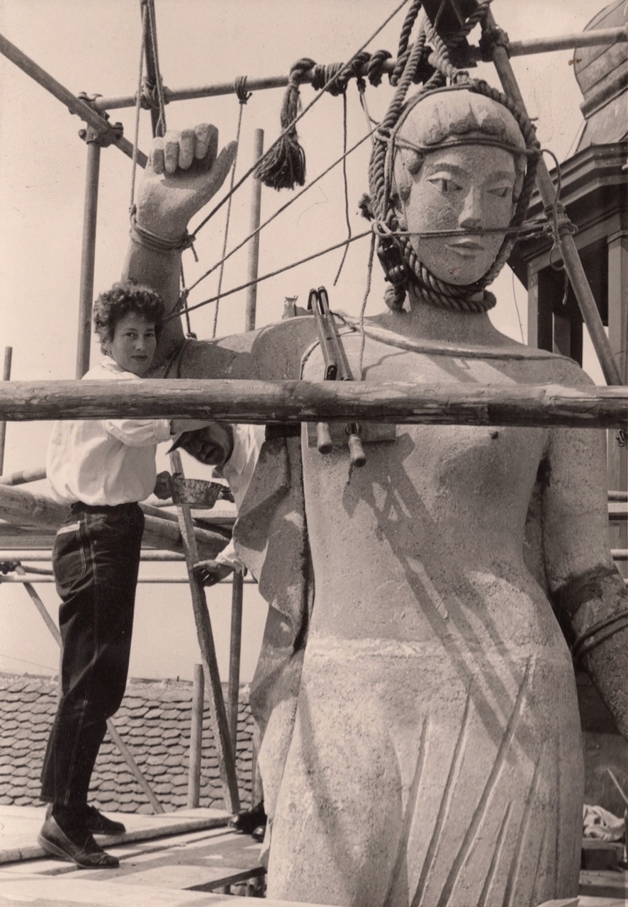 | Dateiinfo (Bild-Unterschrift und Info-Box, automatisch erstellt) | Die Künstlerin Gudrun Kunstmann am Dach des Rathauses der Stadt Windsheim neben "ihrer" Justitia. Urheber: Foto & Studio Heckel, Bad Windsheim<br>Erstellungsdatum: 1959<br>Lizenz: copyright | ||