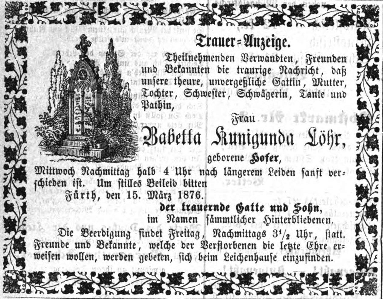| Beschreibung | Traueranzeige für Babetta Kunigunda Löhr, März 1876 | ||