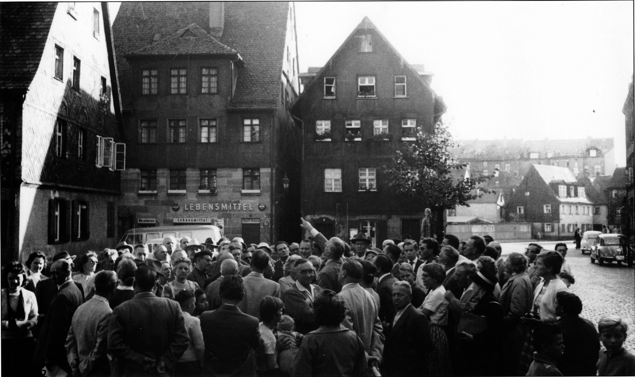| Dateiinfo (Bild-Unterschrift und Info-Box, automatisch erstellt) | Löwenplatz 1 und 3 bei einer Stadtführung mit Adolf Schwammberger Urheber: Fritz Wolkenstörfer<br>Erstellungsdatum: 1960<br>Lizenz: cc-by-sa-3.0 | ||