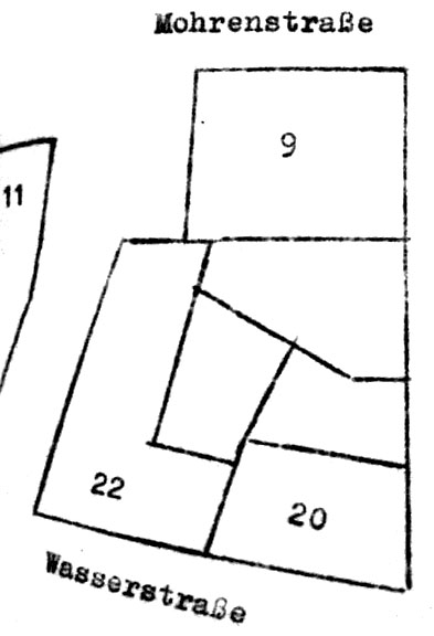 | Dateiinfo (Bild-Unterschrift und Info-Box, automatisch erstellt) | Lageplan Mohrenstraße 9 und Wasserstraße 20 und 22 nach Teilung 1867 Urheber: Gottlieb Wunschel<br>Erstellungsdatum: 1940<br>Lizenz: cc-by-sa-3.0 | ||