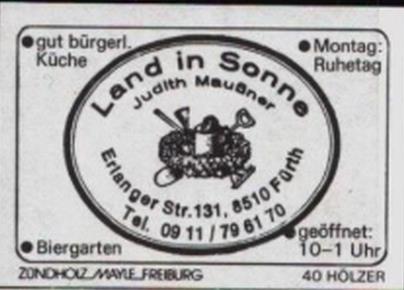 | Beschreibung | Zündholz Werbung der Gaststätte Land in Sonne | ||