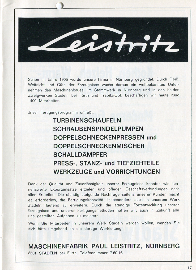 | Beschreibung | Inserat der Firma Leistritz in Stadeln ca. 1960 | ||