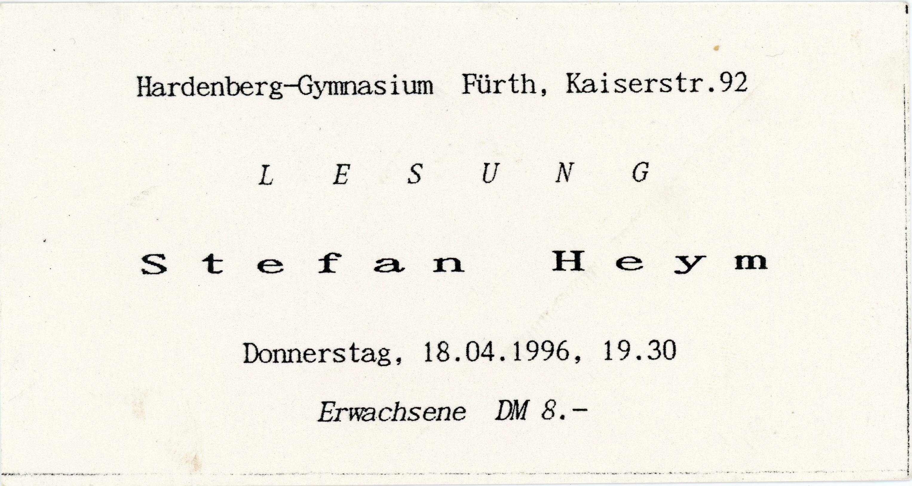 | Beschreibung | Lesung mit Stefan Heym im Hardenberg-Gymnasium, April 1996 | ||